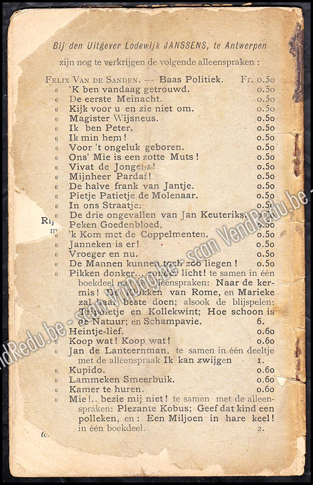 Year: 1887Publisher: Lodewijk Janssens - Drukker-Uitgever, AntwerpenEdition: 2deLanguage: NLPages: 32Condition: GCover condition: FAIRBinding: SCFt: 17*11 cm