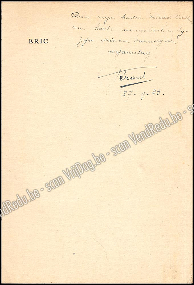 - Met een uitgebreide opdracht "Aan mijn besten vriend Arthur (Marissen) ...", gesigneerd "Gérard 27-9-33."- Arthur Marissen (1900–1980) was de boezemvriend en belangrijkste vertrouweling van de Vlaamse schrijver Gerard Walschap. Hun band ontstond in hun jeugd en bleef bestaan tot aan Marissens dood in 1980. Walschap beschouwde hem als zijn enige echte zielsverwant en noemde hem zijn "vriend door alle jaren heen".Marissen was geen publiek figuur, maar speelde achter de schermen een grote rol. Hij was de eerste die de manuscripten van Walschap las en van kritiek voorzag. Hij steunde Walschap onvoorwaardelijk toen deze in de jaren '30 door de katholieke kerk werd verguisd vanwege zijn vernieuwende en controversiële romans.De vriendschap is uitvoerig gedocumenteerd in een enorme hoeveelheid brieven. Deze correspondentie is van onschatbare waarde voor literatuuronderzoekers omdat Walschap zich hierin zeer openhartig uitliet over zijn twijfels, zijn geloofsafval en zijn schrijfproces.Marissen woonde in Antwerpen en werkte als bediende. Ondanks zijn bescheiden maatschappelijke positie was hij intellectueel de gelijke van Walschap. Na de dood van Arthur Marissen bleef Walschap hem herdenken als de persoon die hem het beste begreep en die zijn literaire loopbaan moreel mogelijk had gemaakt. (AI)
