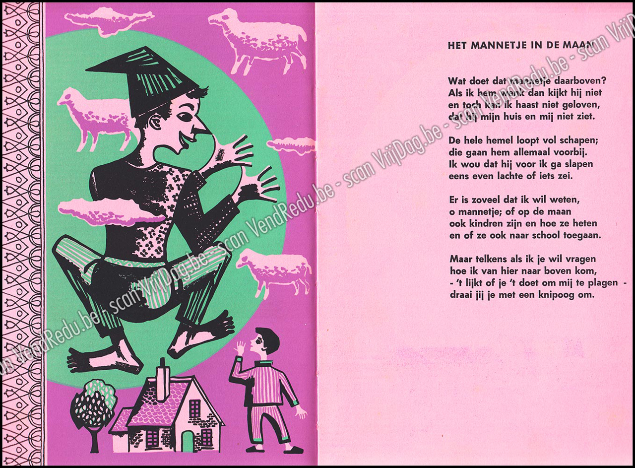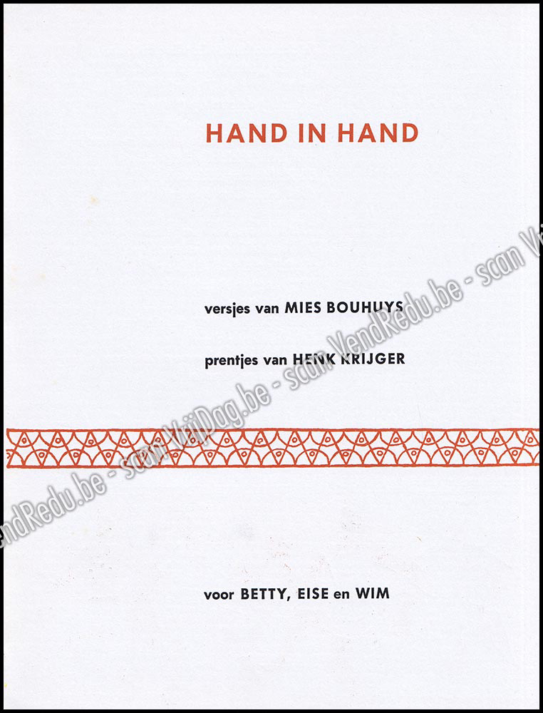 - Het boek "Hand in Hand" uit 1951 is een sfeervolle klassieker waarin de ritmische versjes van Mies Bouhuys samenkomen met de artistieke illustraties van Henk Krijger. Bouhuys, die later grote bekendheid verwierf met Pim en Pom, toont in dit vroege werk haar talent om de belevingswereld van jonge kinderen in eenvoudige maar pakkende rijmpjes te vatten.