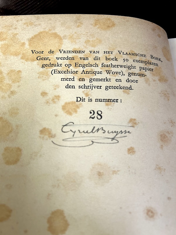 - Voor de VRIENDEN VAN HET VLAAMSCHE BOEK, Gent, werden van dit boek 50 exemplaren gedrukt op Engelsch featherweight papier (Excelsior Antique Wove), genummerd en gemerkt en door den schrijver geteekend.Dit is nummer : 28