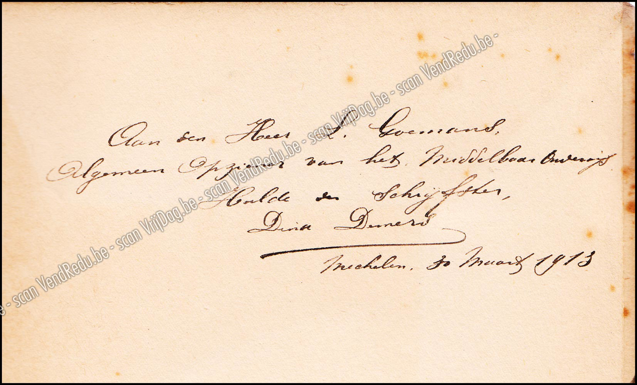 - Met opdracht aan Leo Goemans, “opziener van het middelbaar onderwijs” of “hoofdinspecteur” in het Belgische middelbaar staatsonderwijs (13 woorden). Gesigneerde en gedateerde (Mechelen, 30 maart 1913) 1ste druk.