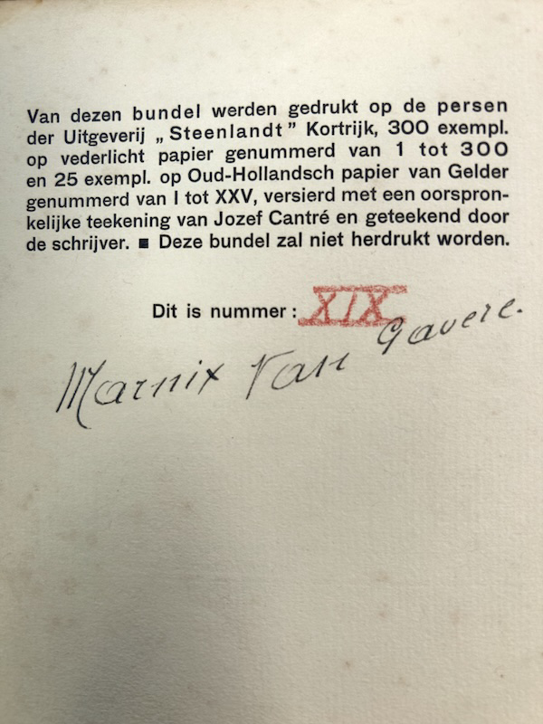 - Colofon: Van dezen bundel werden gedrukt op de persen der Uitgeverij, "Steenlandt" Kortrijk, 300 exempl. op vederlicht papier genummerd van 1 tot 300 en 25 exempl. op Oud-Hollandsch papier van Gelder genummerd van I tot XXV, versierd met een oorspronkelijke teekening van Jozef Cantré en geteekend door de schrijver. Deze bundel zal niet herdrukt worden.