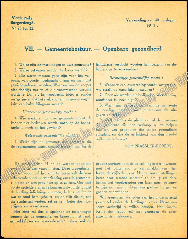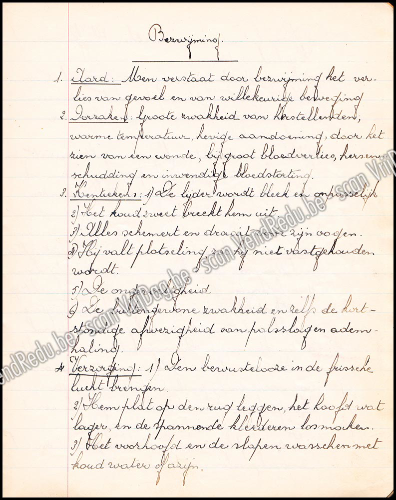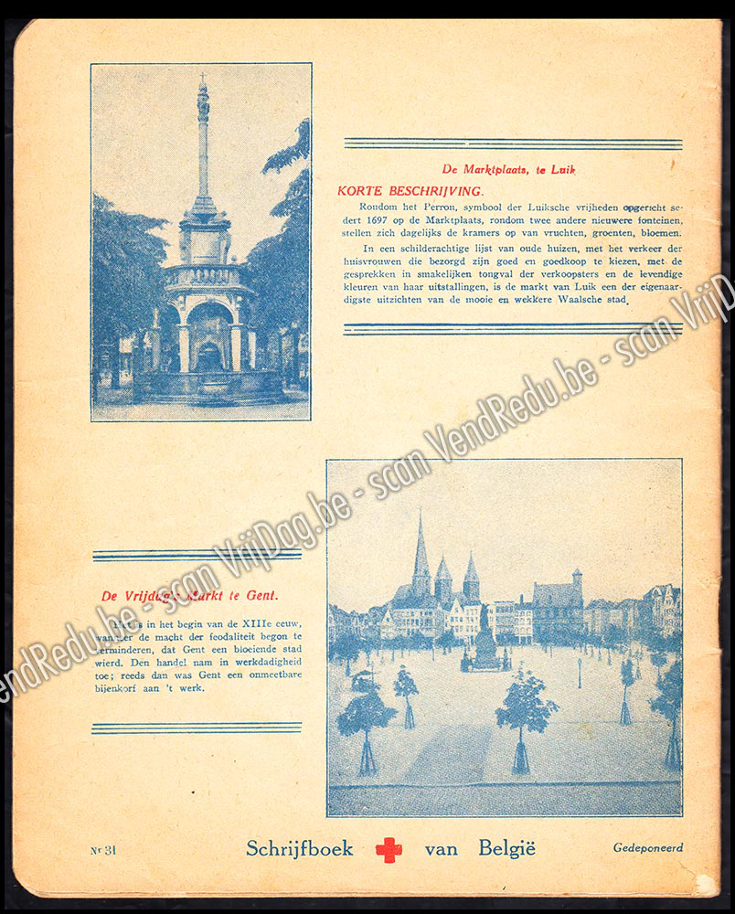 - Het "Schrijfboek de scholier van het Rood Kruis van België" (vaak met de Franse titel Cahier de l'Ecolier op de achterzijde) is een historisch educatief item dat door de organisatie werd uitgegeven om eerste hulp en hygiëne onder de schooljeugd te promoten. Kenmerken van dit schrijfboek:Samenwerking: Deze schriften werden geproduceerd door de uitgeverij Cahier l'Écolier in directe samenwerking met het Belgische Rode Kruis.Educatieve functie: In tegenstelling tot een gewoon schrift, bevatten deze boekjes vaak illustraties en korte instructies over EHBO, verkeersveiligheid of persoonlijke verzorging. Het doel was om de principes van het Rode Kruis spelenderwijs in de klasomgeving te integreren.Periode: Deze schriften waren vooral in gebruik in het midden van de 20e eeuw (jaren '50 en '60), toen de organisatie een sterke focus had op de morele en fysieke vorming van de jeugd via het Jeugd Rode Kruis.Vormgeving: Ze zijn herkenbaar aan de kartonnen kaft met vaak een afbeelding van een helpend kind of een ambulance, en de kenmerkende rode kruisen op de hoeken of in het logo. Waar te vinden?Tegenwoordig worden deze schrijfboekjes beschouwd als verzamelobjecten of onderwijserfgoed:Museumcollecties: Exemplaren zijn onder andere terug te vinden in de collectie van "De School van Toen" (een museum voor de geschiedenis van het onderwijs in Gent).Verzamelaars: Ze duiken regelmatig op op tweedehandsplatforms zoals 2dehands.be of gespecialiseerde beurzen voor schoolcuriosa onder de termen "Rode Kruis curiosa" of "oude schoolschriften". Dit soort materiaal was de voorloper van de huidige digitale lespakketten en moderne handboeken voor leerkrachten die het Rode Kruis nu verspreid om eerste hulp op scholen te onderwijzen.- Boekje volgeschreven met eerstehulp lessen.