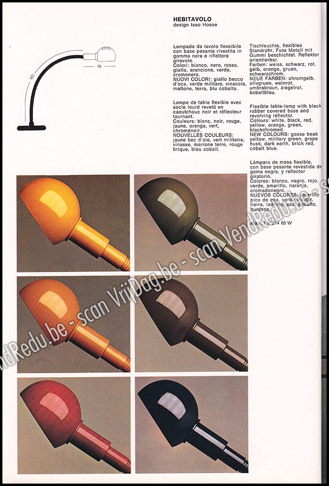 Binnen de pagina's van dit verzamelobject vind je de absolute klassiekers van het merk. Denk aan de Hebi-slangenlamp van Isao Hosoe, die door zijn flexibele metalen buis in elke gewenste vorm kon worden gebogen, en de futuristische Pistillo van Studio Tetrarch, die met zijn uitwaaierende sprieten een dramatisch lichtspel op de wanden werpt. Ook de minimalistische ontwerpen van Olaf von Bohr, zoals de Medusa en de Laura, staan prominent in dit overzicht, vaak afgebeeld in de destijds razend populaire kleur oranje.