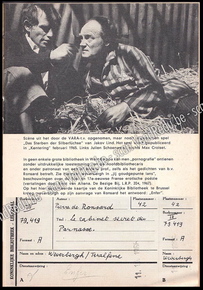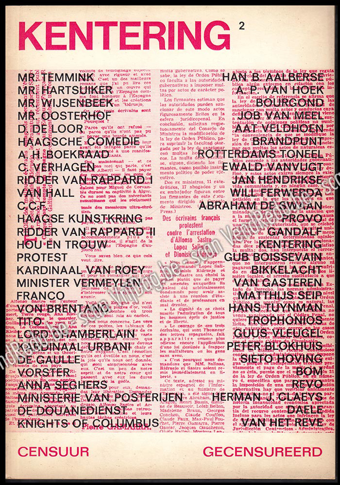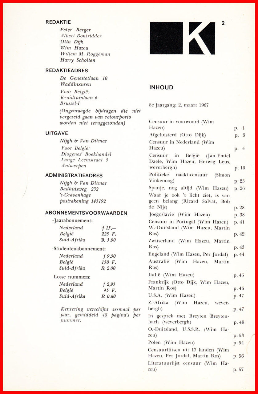 INHOUD:Censuur in voorwoord (Wim Hazeu).Afgeluisterd (Otto Dijk). Censuur in Nederland (Wim Hazeu).Censuur in België (Jan-Emiel Daele, Wim Hazeu, Herwig Leus, weverbergh).Politieke naakt-censuur (Simon Vinkenoog). Spanje, nog altijd (Wim Hazeu). Waar je ook 't licht ziet, is van geen belang (Ricard Salvat, Bob de Nijs). Joegoslavië (Wim Hazeu). Censuur in Portugal (Wim Hazeu). W.-Duitsland (Wim Hazeu, Martin Ros). Zwitserland (Wim Hazeu, Martin Ros). Engeland (Wim Hazeu, Per Jordal). Australië (Wim Hazeu, Martin Ros). Italië (Wim Hazeu). Frankrijk (Otto Dijk, Wim Hazeu, Martin Ros). U.S.A. (Wim Hazeu). Z.-Afrika (Wim Hazeu, weverbergh). In gesprek met Breyten Breytenbach (weverbergh). O-Duitsland, U.S.S.R. (Wim Hazeu). Polen (Wim Hazeu). Censuurflitsen uit 17 landen (Wim Hazeu, Per Jordal, Martin Ros). Literatuurlijst censuur (Wim Hazeu).