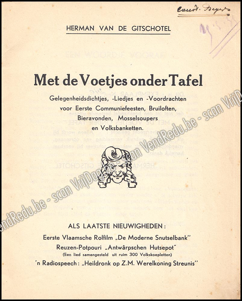 "Elke vogel zingt zooals hij gebekt is", zegt het spreekwoord. Dat hij met zijn boek, getiteld «Met de Voetjes onder tafel», geen overdreven letterkundige pretentie heeft gekoesterd, behoeft geen betoog; trouwens, hij zelf, en al dadelijk zijne geloofspapieren «Mijn Muschke» zal zulks getuigen.