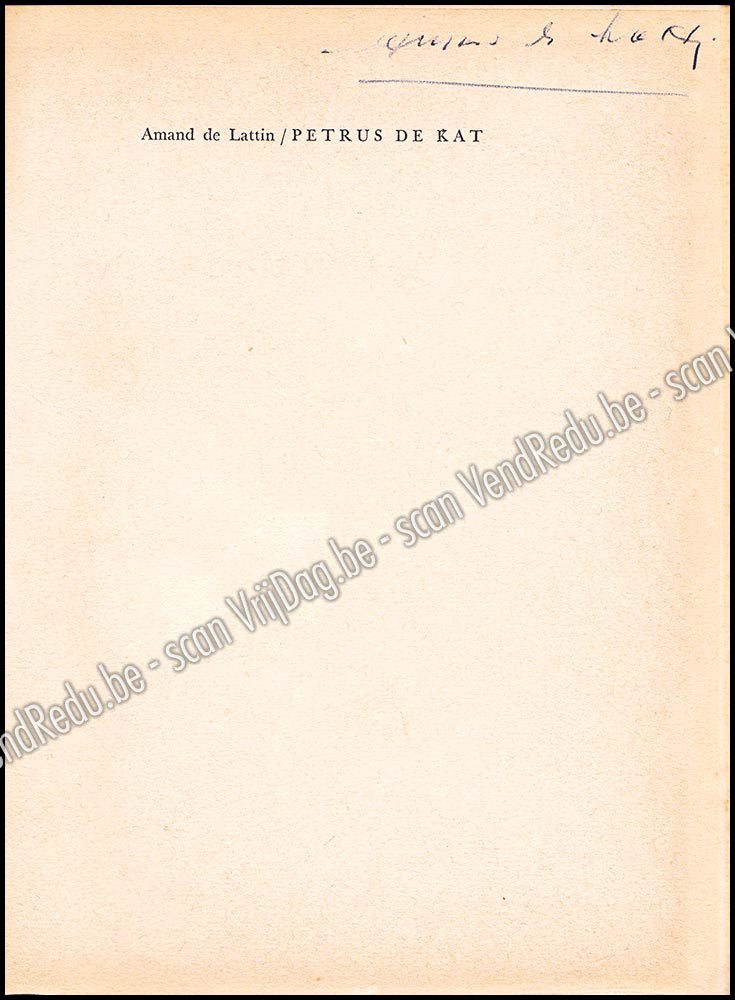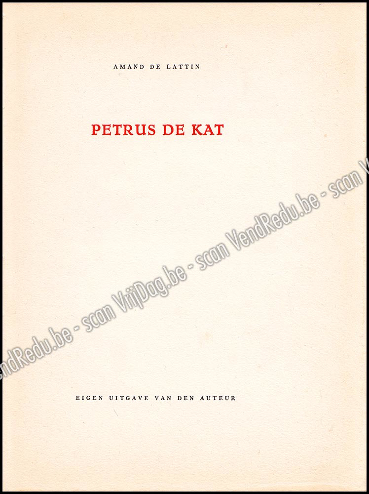- Petrus de kat is een minder bekende publicatie van de Antwerpse auteur en lokaal historicus Amand de Lattin (1879–1959). Het boek werd door de auteur in eigen beheer uitgegeven (vaak aangeduid als "Eigen uitgave nr. 27").Amand de Lattin stond vooral bekend om zijn werken over de geschiedenis, folklore en anekdotiek van de stad Antwerpen (zoals zijn bekende reeks Evolutie van de Antwerpse stadsgezichten en Sinjorenstad). In zijn werk wist hij historische feiten vaak te vermengen met volksverhalen en lokale sfeerbeelden. Het boek is tegenwoordig vooral een gezocht item voor verzamelaars van Antwerps erfgoed en bibliofiele uitgaven.- Prachtig omslag door EVH, Elza Van Hagendoren.- Elsa (Elza) van Hagendoren (Gembloux, 4 december 1904 – 1998) was een vooraanstaande Belgische illustratrice en schrijfster, vooral bekend om haar uitgebreide werk in de kinder- en jeugdliteratuur. Tussen 1919 en 1921 verbleef zij met haar ouders in Colombia, waar ze lessen volgde aan de kunstacademie van Bogotá. Ze trouwde later met de Vlaams-nationalistische journalist en boekverkoper Herman Oosterwijk. Van Hagendoren was een veelzijdige kunstenares die een stempel drukte op de visuele cultuur van haar tijd:Ze illustreerde een breed scala aan publicaties, waaronder kinderboeken, tijdschriften, schoolboeken, romans en posters.Ze werkte nauw samen met uitgeverijen zoals De Sikkel in Antwerpen en Het Getij in Mortsel.Ze verzorgde de illustraties voor een speciale editie van De Leeuw van Vlaanderen (1939).Ze schreef en illustreerde eigen werken zoals Faasje en Liesje.Haar onderwerpen varieerden van dagelijkse taferelen tot meer exotische thema's, zoals ontdekkingsreizen in Afrika. Haar werk wordt gekenmerkt door een eigenzinnige stijl die zowel artistieke waarde als educatieve doeleinden diende.- Gesigneerd door Amand.
